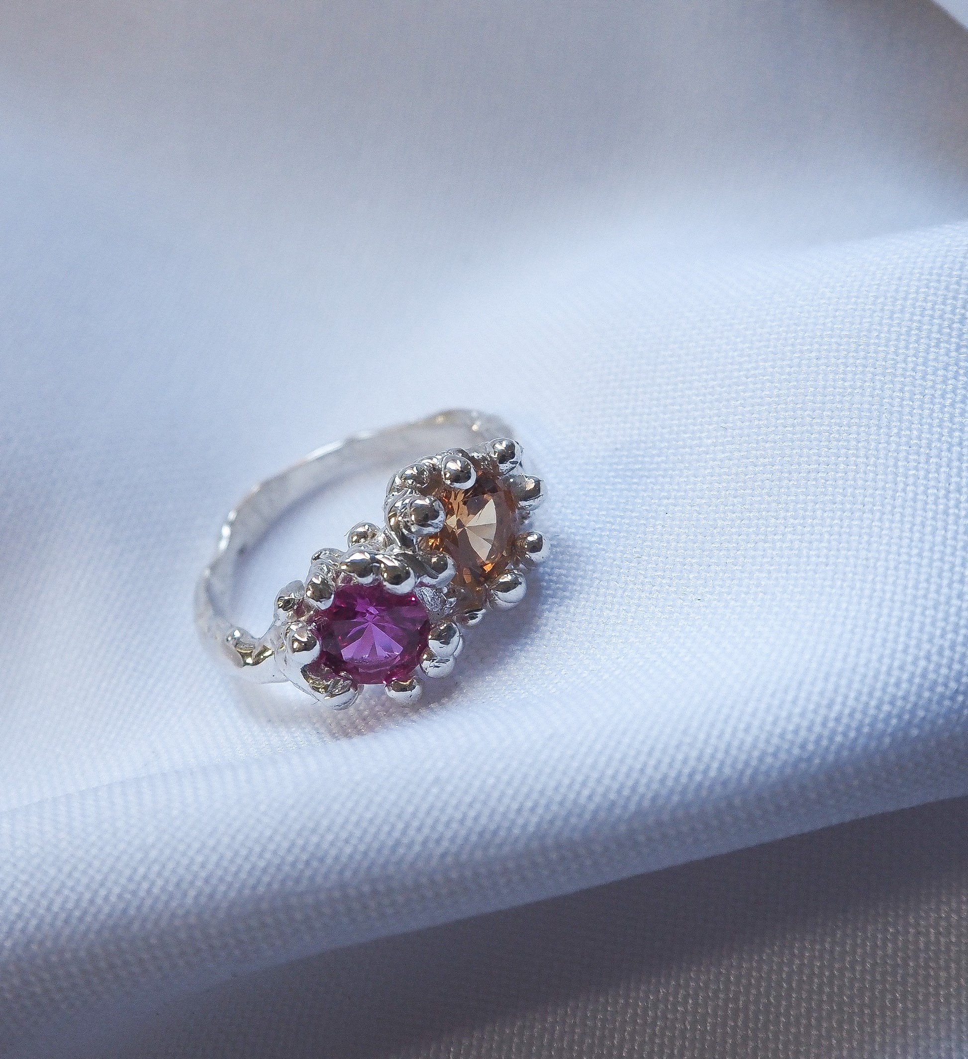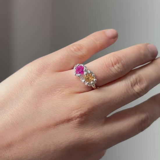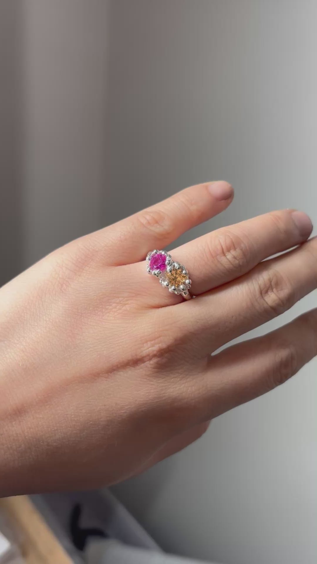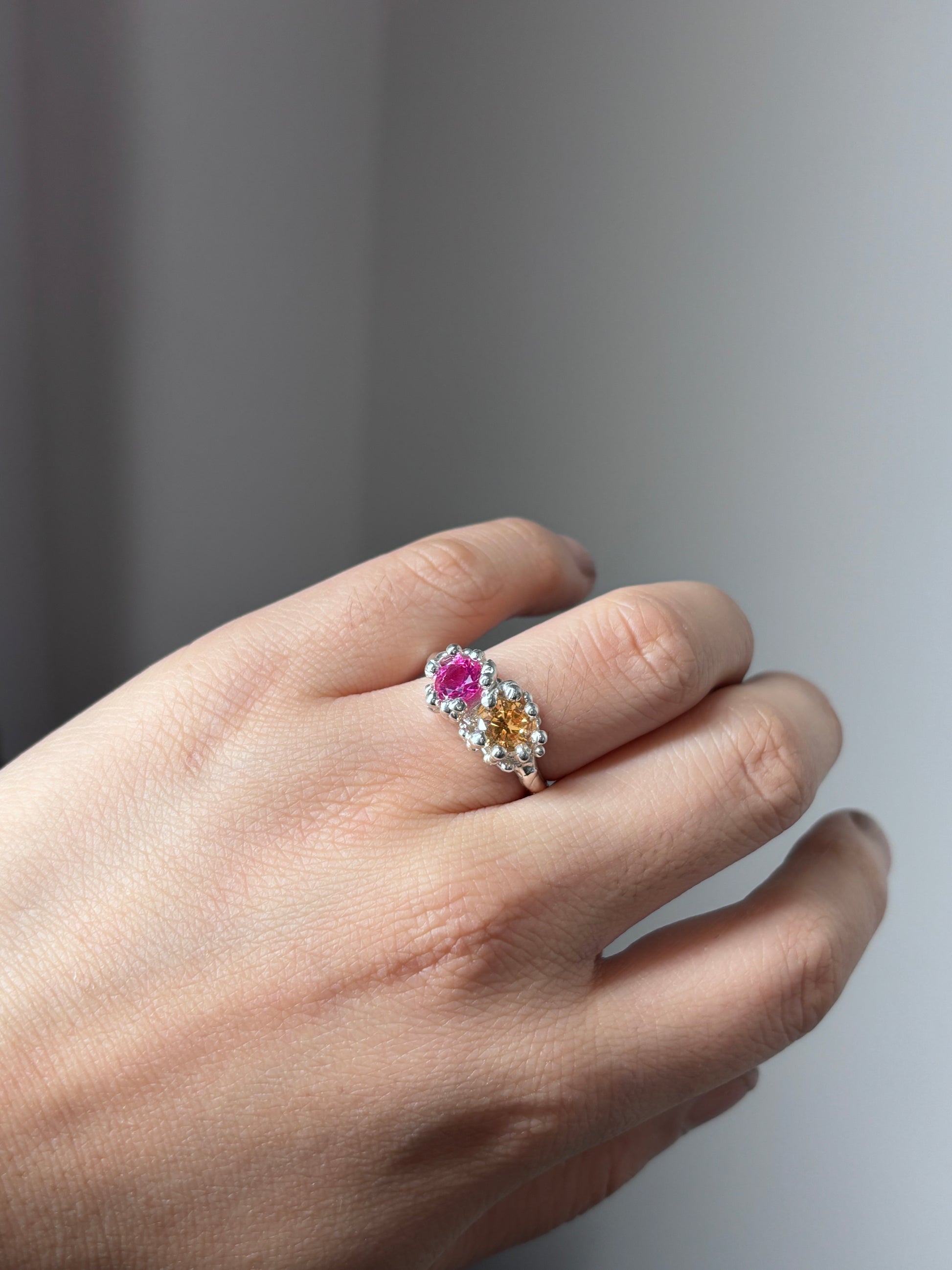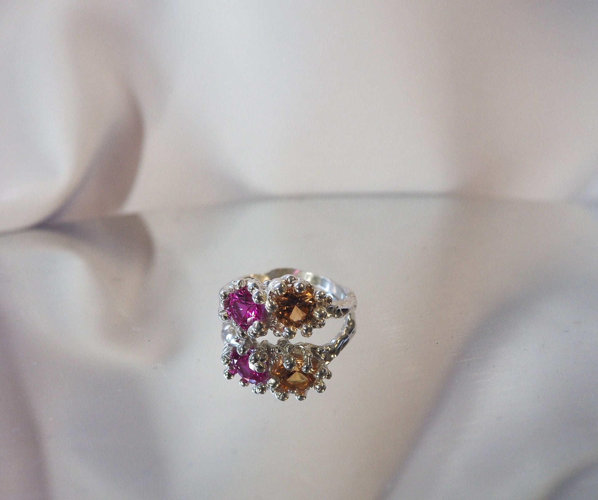A one of a kind ring made with lab grown sapphires in soft pink and warm amber tones. The gemstones are arranged in an organic cluster, giving the ring a natural, blooming shape. Hand-formed in sterling silver, the design shows gentle textures and small details that catch the light from every angle.