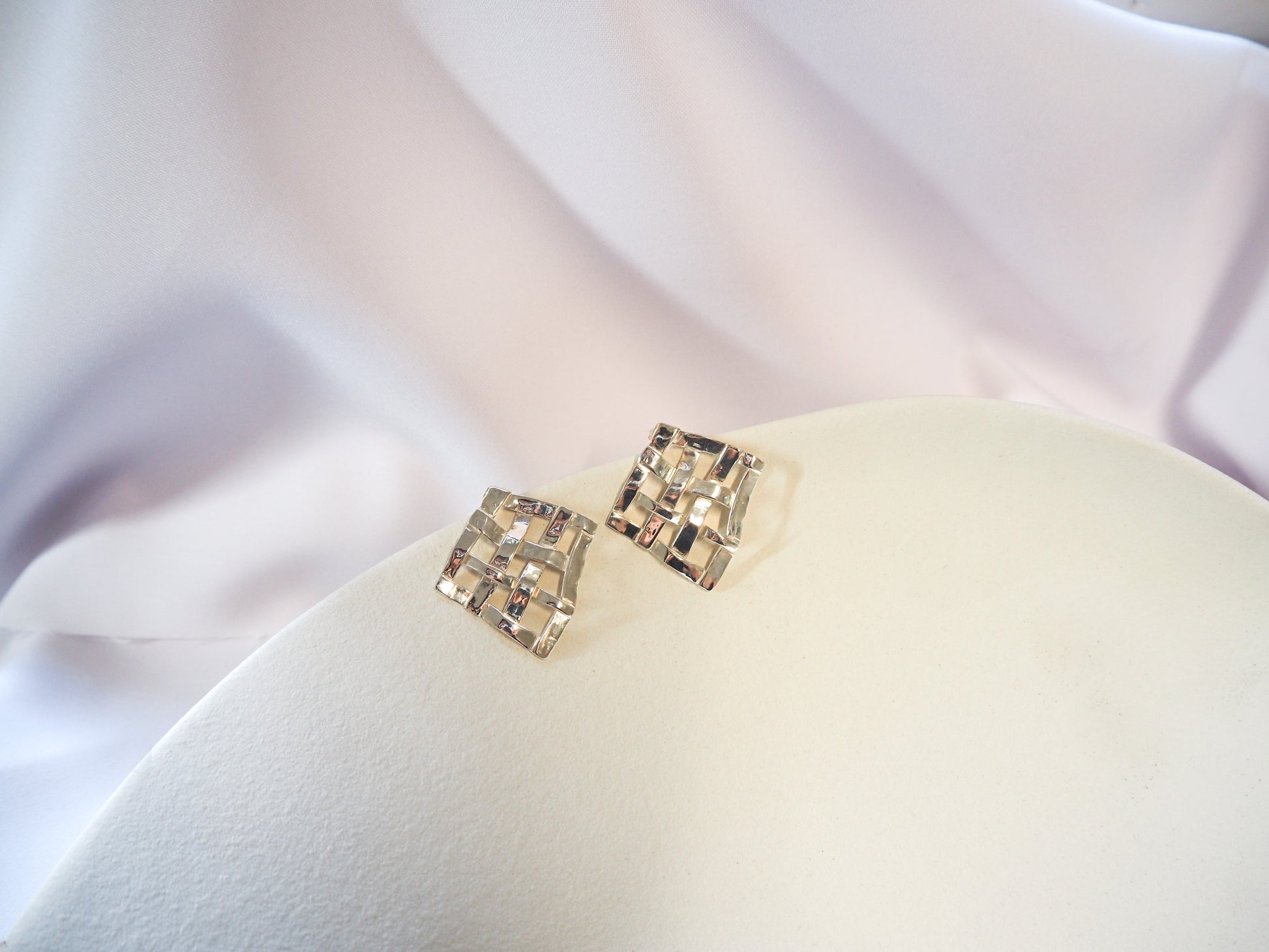 A sculptural square earring formed from interlaced metal strips, creating a modern woven pattern. The mirrored surfaces catch light from every angle, giving the piece depth and subtle movement.